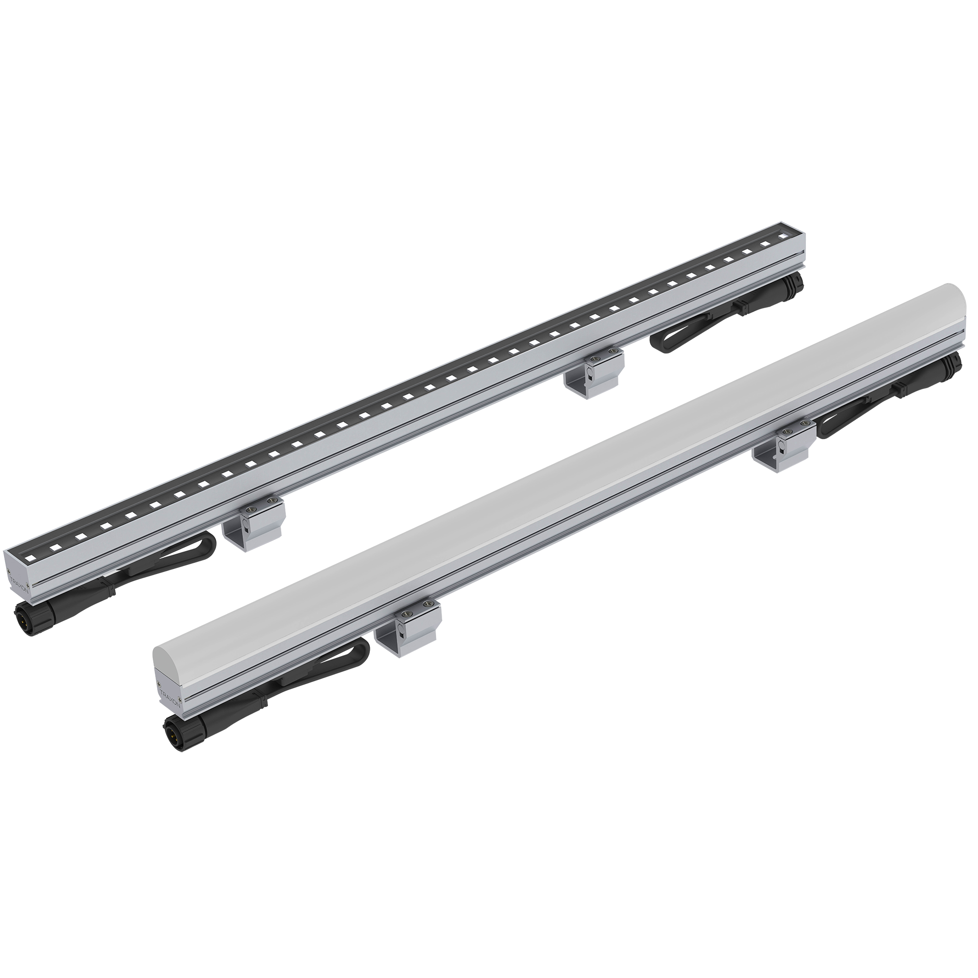 Powerful and affordable exterior linear luminaires, available in white or color-changing options for illuminating facades and architectural features.